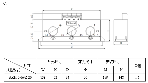 具体型号:AKH-0.66/Z-3*Φ20