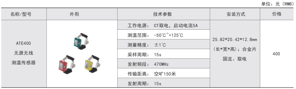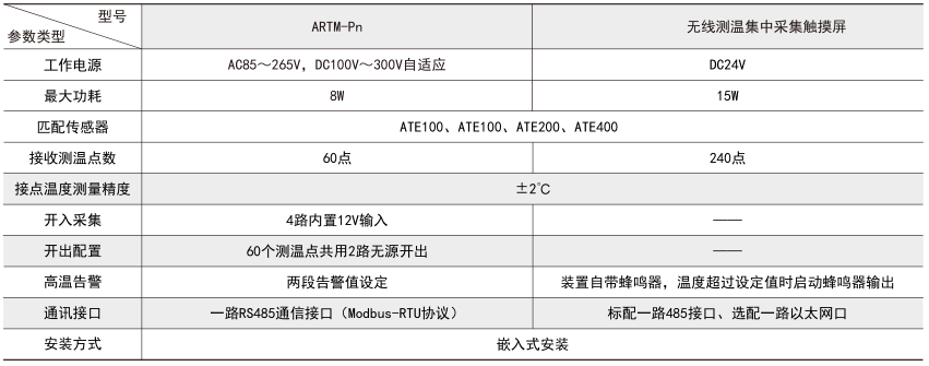 ARTM-Pn无线测温装置:ARTM-Pn无线测温装置可以单独安装在高压柜、低压抽屉柜内,每台装置可以接收18个传感器的数据,传感器型号可选配ATE100、ATE200、ATE300。装置带有一路485接口,可将采集到的温度数据上传到监控中心。