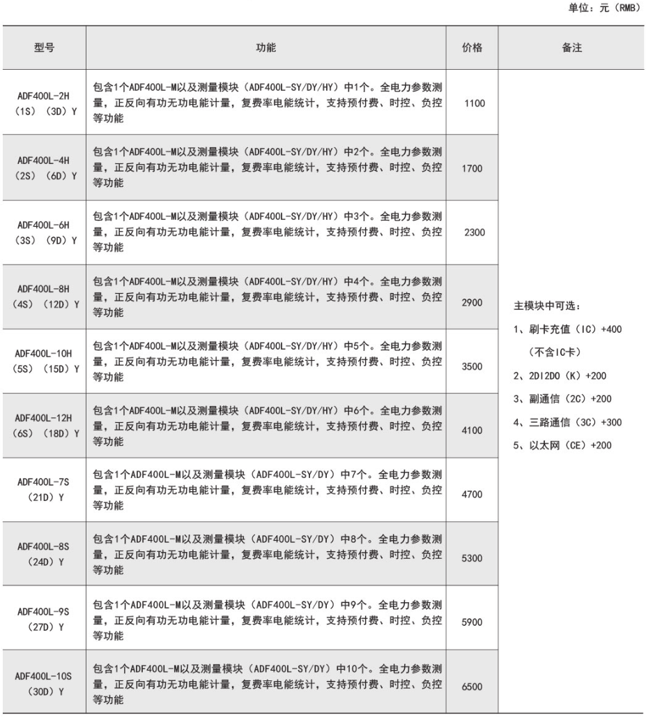 ADF400L系列多用户电能表,通过模块组合的方式最大可实现12路三相或36路单相的直接接入测量或12路三相互感器接入测量、直接接入和互感器接入的混合测量方式,该系列电能表因准确度高、集中安装、集中管理、安装灵活性高,互不干扰等优势深受小区、学校、企业等的青睐。该系列仪表支持预付费功功能。