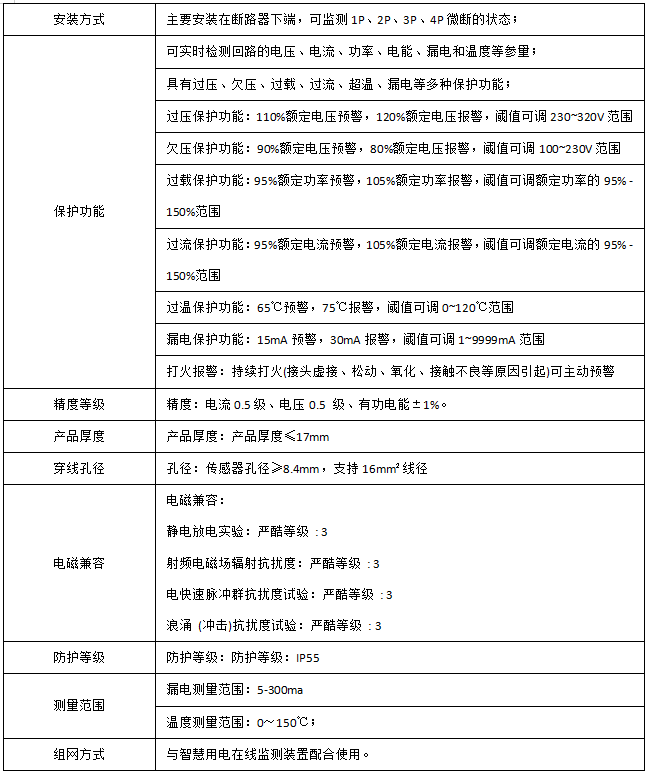 用于对用电线路的关键电气因素,如电压、电流、功率、温度、漏电、打火、能耗等进行实时监测,具有预警报警、电能计量统计、故障定位等功能。