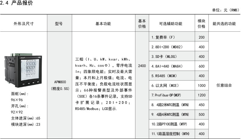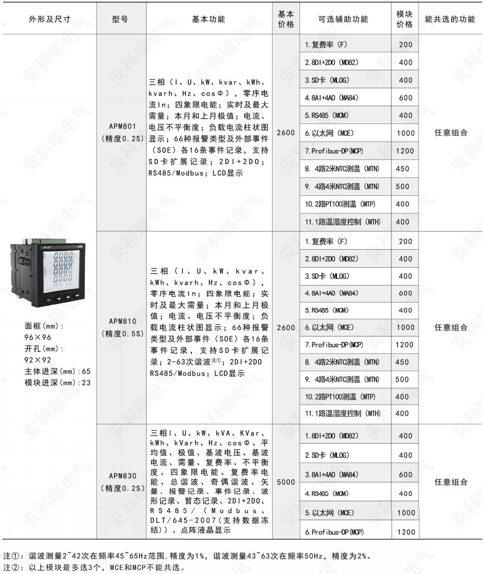 APM系列网络电力仪表按IEC标准设计,具有全电量测量,电能统计,电能质量分析及网络通讯等功能,主要用于对电网供电质量的综合监控诊断及电能管理。该系列仪表采用了模块化设计,当客户需要增加开关量输入输出,模拟量输入输出,SD卡记录,以太网通讯时,只需在背部插入对应模块即可。