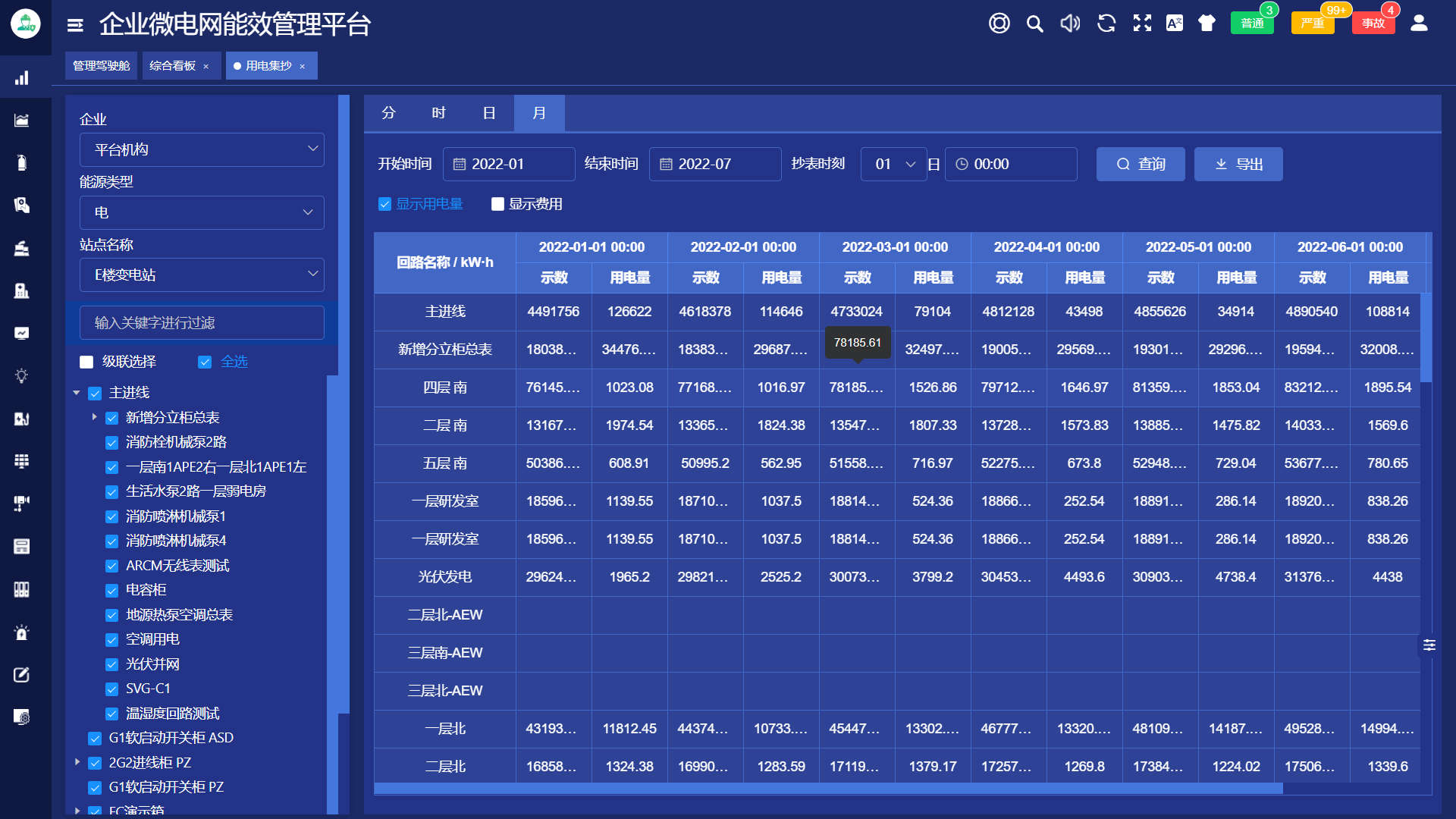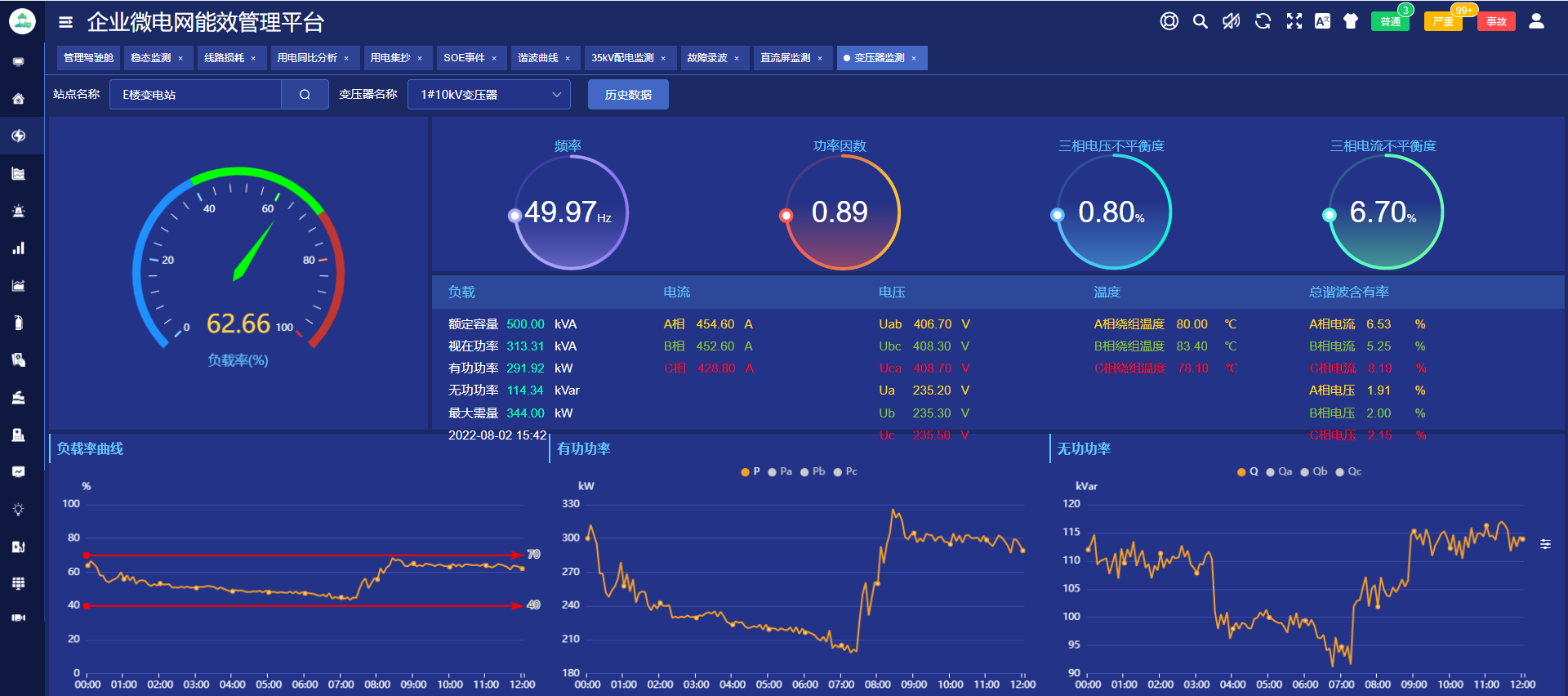本项目共计5台变压器,10台高压柜,共有72个出线回路。安科瑞为该项目提供Acrel EMS企业微电网系统,包含一套Acrel EMS电力监控软件,72台AEM96/CFK多功能仪表以及6台AM5系列综保。