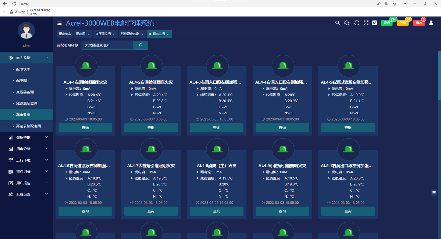 大凭高速共64个变电所其中隧道配电房有44个,收费站服务区配电房有20个,每个配电房均配置有电气火灾探测器,高压综保,低压多功能表,无功补偿监控装置,温控仪,UPS,EPS,柴发等设备。总计点位5300个左右。