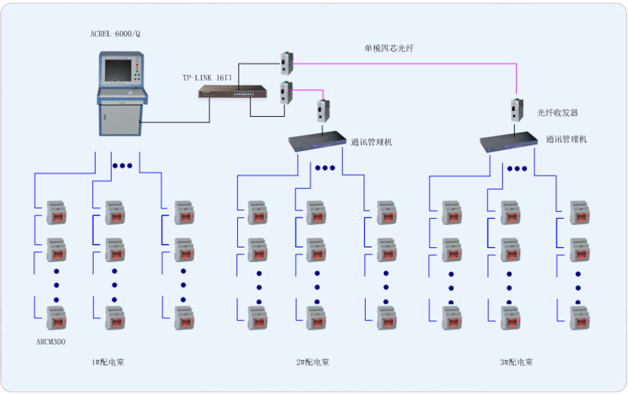系统组网共分为站控管理层、网络通讯层、现场设备层三层,该项目通讯总线共接入20条通讯总线,总线在楼层配电箱手拉手串接后,接入Acrel-6000/Q电气火灾监控设备,组成电气火灾系统的大动脉。箱体中漏电流互感器通过电流线接入漏电探测器,漏电探测器实时显示漏电情况,组成一套信号稳定,精度可靠的电气火灾监测系统。现场共有449只ARCM系列电气火灾探测器模块。