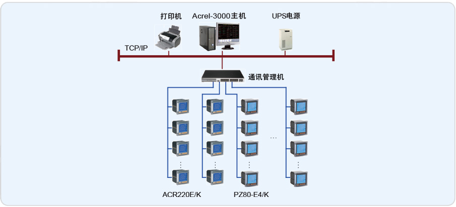 四川机械设计制造研究所主站层位于一层总值班室内,电力监控系统的站控管理层设备具体包括:Acrel-2000电力监控系统工控机一套、打印机、UPS。负责将通讯管理层上传的数据解包,进行集中管理和分析,执行相关操作、以及整个变配电系统的整体监控。网络通讯层设备的选型主要从两个方面考虑,一个是用户需求,功能实现方面;二是根据现场情况,综合项目的费用来考虑的。针对这个项目来说网络通讯层设备采用性价比高的4口带隔离的通讯管理机。两路进线选择的是安科瑞生产的ACR220E/K网络电力仪表;出线回路选择的是安科瑞生产的PZ80-E4/K。