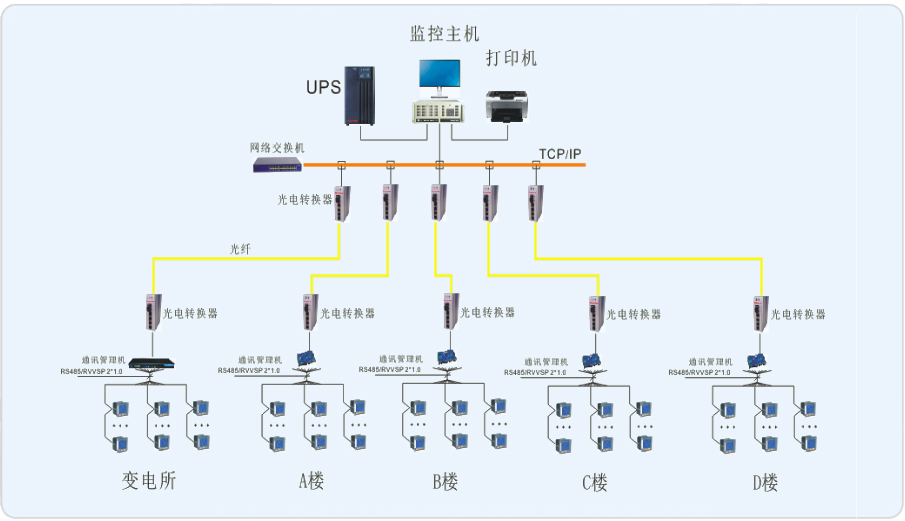 上海金桥德勤通用厂房共1个10KV/0.4KV配电房,在配电房内有0.4KV的安科瑞PZ96L-E4仪表102块;A#有安科瑞PZ96L-E4仪表13块,B#有安科瑞PZ96L-E4仪表8块;C#和D#分别有安科瑞PZ96L-E4仪表4块,上海金桥德勤通用厂房共用安科瑞仪表133块。对于上海金桥德勤通用厂房的配电情况,在每栋大楼里安放了采集器通过光纤到A栋的消防控制室,配电房的仪表连接至安放在配电室旁边的通讯机柜再通过光纤到消防控制室,将所有的仪表连接一起,实现对上海金桥德勤通用厂房用电的实时管理。