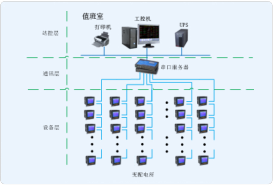 本项目设计为变配电所部分电力监控系统,变配电所位于地下一层,其中有两路高压进线,配有综合保护装置,低压部分,进线柜、馈线柜配有仪表,本电力监控系统监控范围为低压部分装置。通过组建系统网络,电力仪表通过现场总线直接接入变电所内采集设备,并将数据上传至Acrel-2000电力监控系统,实时监测变电所内各个回路的电流、电压、功率、开关状态等电参量,由此达到变电所少人值守或无人值守的智能化管理。