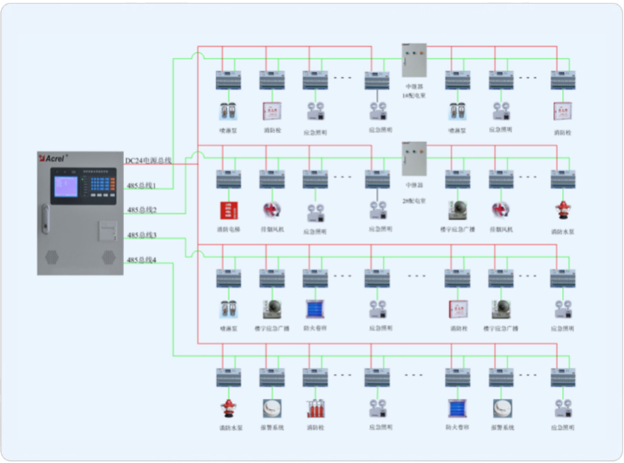 安科瑞电气于2015年为该项目提供AFPM100小型8868体育电源监控系统解决方案,该系统采用8868体育电源状态监控器+电压/电流传感器的两层结构组网模式,从而简化了系统结构设计。系统组网共分为站控管理层、网络通讯层、现场设备层三层,该项目通讯总线共接入4条通讯总线,总线在楼层配电箱手拉手串接后,接入壁挂式后台,组成8868体育电源监控系统的大动脉。
