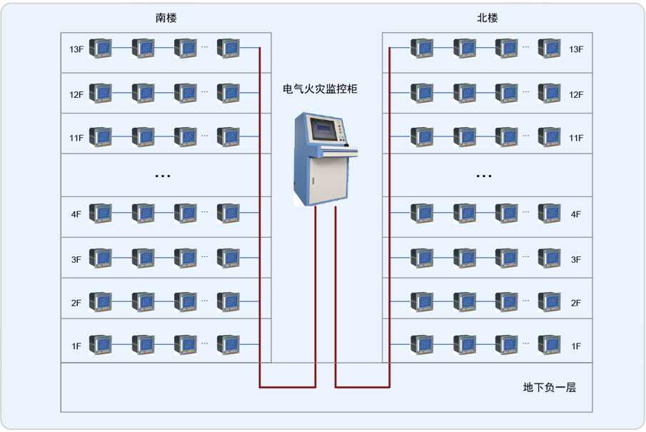 站控管理层针对电气火灾监控系统的管理人员,是人机交互的直接窗口,也是系统的上层部分。主要由系统软件和必要的硬件设备,如监控主机、显示器、UPS电源等组成。监测系统软件具有良好的人机交互界面,对现场各类数据信息计算、分析、处理,并以图形、数显、声音、指示灯等方式反应现场运情况。