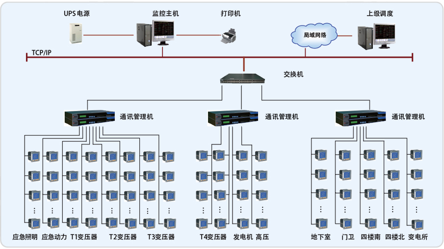 本监控系统主要实现对月亮湾集中供冷中心的20/0.4kV配电系统进行监 控;监控范围为变电所的T1、T2、T3、T4变压器进线柜、联络柜、应急照明配电屏1/2、应急动力配电屏1/2、高压柜、变电所的1/2#柴油发电机配电屏和各楼层所有动力柜。总共300个回路。
