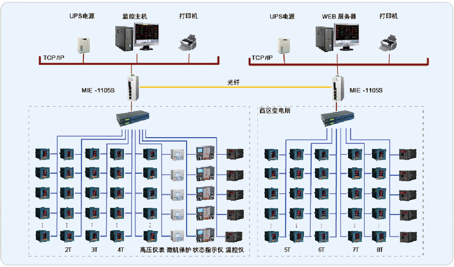 本监控系统主要实现中科院苏州医工所的10/0.4kV配电系统进行用电监测与电能管理;监测范围为一楼变电所的T3、T4变压器进线柜,联络柜,温控仪和二楼变电所的T1、T2变压器进线柜,联络柜,温控仪,高压侧仪表及综保进行远程实时监控和电能管理。该系统总计有110只仪表(其中包括100只ACR220E,6只ABB,4只温控仪),分7条总线,其中一楼变电所3条总线,二楼变电所4条总线,两变电所都是直接通过屏蔽双绞线走桥架拉至值班室连接到串口服务器,再通过网线连接至监控主机实现总线上仪表与监控主机的数据连通。