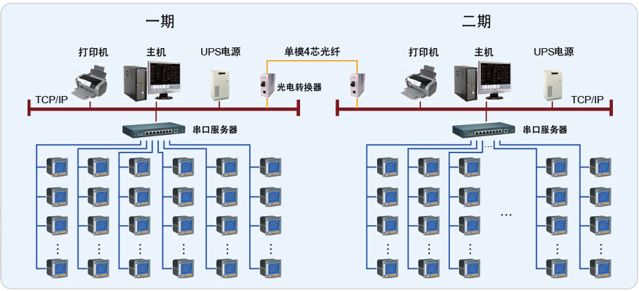 一期配电房由两个相互独立的配电房组成,动力中心配电房包含主室和次室,次室距主室的约30米。其中Acrel-2000电力监控系统在动力中心配电室的次室里。动力中心配电房有2台变压器(1#变压器、2#变压器),共有57台ACR120EL;现场采用4根屏蔽双绞总线连接。生产车间配电房中有2台变压器(3#变压器、4#变压器),共有39台智能仪表,现场采用2根RS485总线上传至主机。