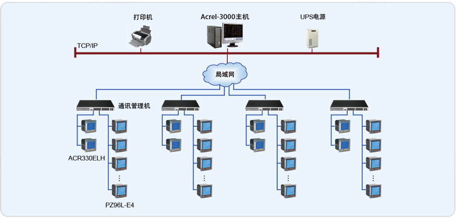 该系统总计有79只仪表(其中包括8只ACR330ELH谐波仪表,71只PZ系列智能仪表),分8条总线,由于四个变电所之间距离较远,并且较为分散,采用每个变电所内自行组网,然后并入惠氏公司内部局域网的方式,实该现场总线上仪表与监控主机的数据连通。