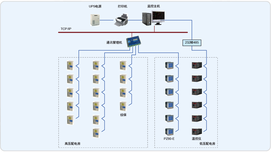 该项目是一个新建厂区的配电系统,包含35KV变压器2台,10KV变压器3 台,项目中监控范围为35KV线路微机保护装置2台,变压器温控仪8台,10KV微机保护装置12台,安科瑞智能仪表8台,本套系统主要强调实时数据的监测、控制,主要针对整个配电系统可靠性进行全程的智能化监控,数据分析,投、断,以及对各回路所用电能进行统计。