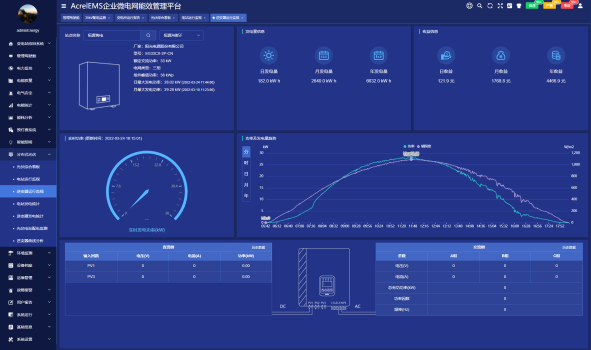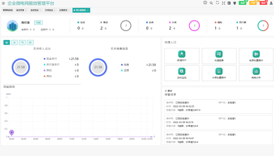 为平台主界面,针对于企业微电网的源、网、荷、储、充的各个关键节点安装监测、分析、保护、治理装置, 通过高性能边缘计算网关采集数据并上传至企业微网平台。平台根据新的电网价格、用电负荷、电网调度指令等情况, 调整各系统控制策略并远程下发,使企业微电网始终高效稳定运行,降低企业用电成本,实现能源互联、信息互动。