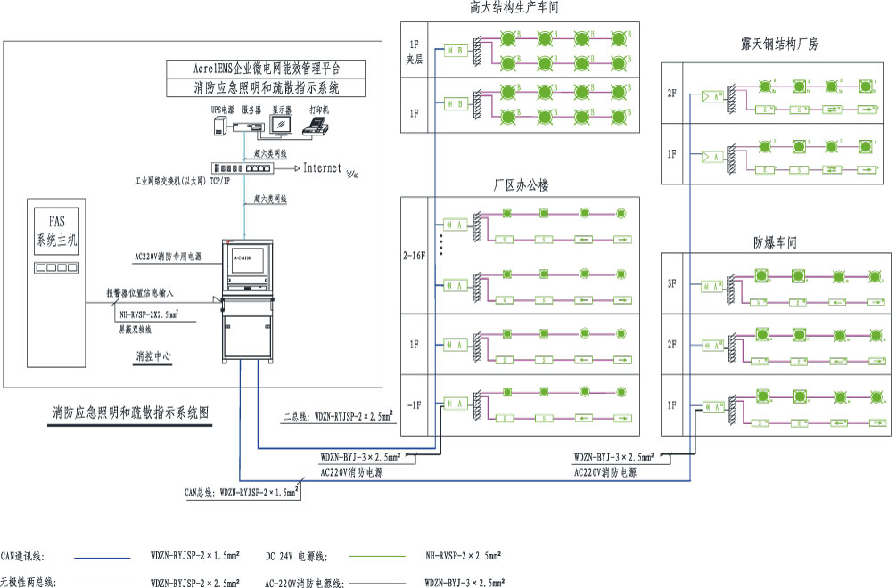 消防应急照明和疏散指示系统主要由应急照明控制器、消防应急照明集中电源或应急照明配电箱、消防应急灯具等几部分组成。该套系统符合国家现行的行业规范,可以满足与AcrelEMS企业微电网管理云平台或火灾自动报警系统等进行数据交换和共享。