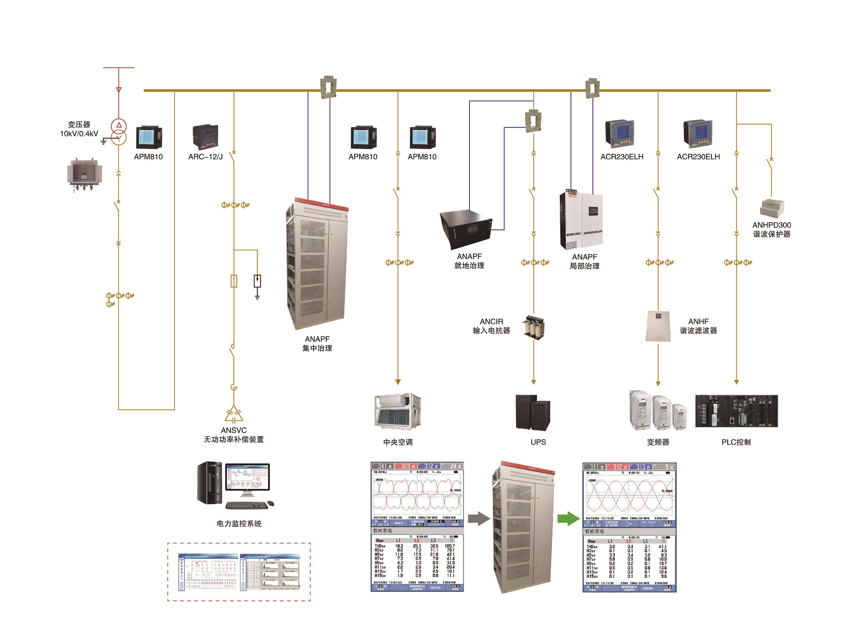 电能质量分析与治理系统主要是研究消除供配电系统中的无功补偿和谐波治理问题,主要的产品有有源电力滤波器、低压无功功率补偿装置、静止无功发生器、混合动态滤波补偿装置、混合动态消谐补偿装置、智慧型动态无功补偿装置、谐波保护器等,适用于新建、改建、扩建和技改项目中工业与民用及公共建筑内电气设备的无功补偿、谐波抑制及综合治理等,可根据不同行业类型和负载类型的电能质量问题提供合适的设计解决方案,以达到改善供电质量和确保电力系统安全经济运行的目的。
