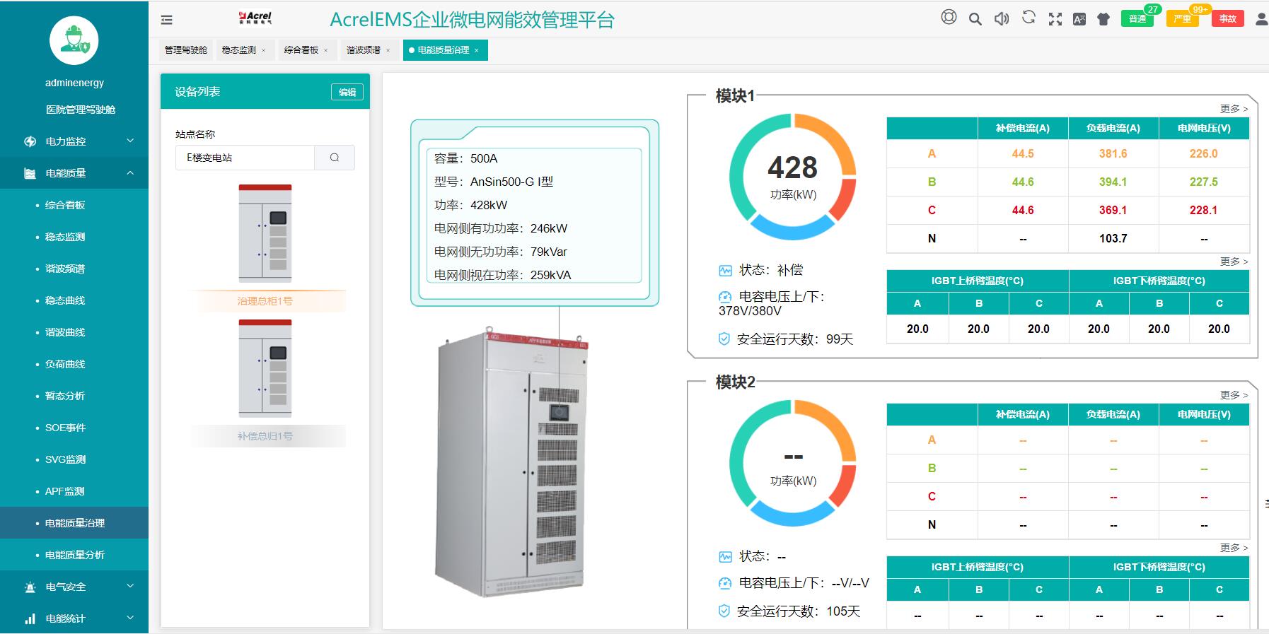 线性输出,无功功率全容性-全感性输出的同时,可滤除特定次谐波;具备三相不平衡治理及稳压功能;补偿后系统功率因数≥0.99;具有有源滤波功能,单模块有四种规格:30kvar无功+15A滤波,50kvar无功+25A滤波,75kvar无功+37.5A滤波,100kvar无功+50A滤波;模块化并联设计;基于谷歌Fliutter框架构建的遥信、遥控软件平台,具备远程服务与数据处理功能;支持IOS、安卓、PC多平台交互。