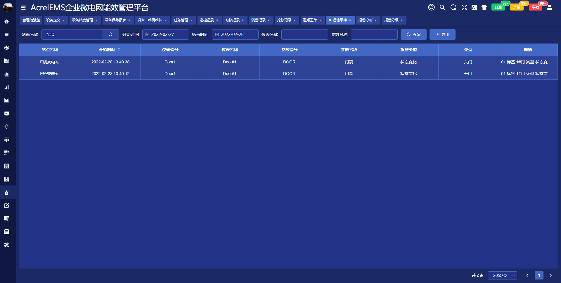 电力监控系统能够对遥信变位,保护动作、事故跳闸,以及电压、电流、功率、功率因数越限等事件记录进行存储和管理,方便用户对系统事件和报警进行历史追溯,查询统计、事故分析。