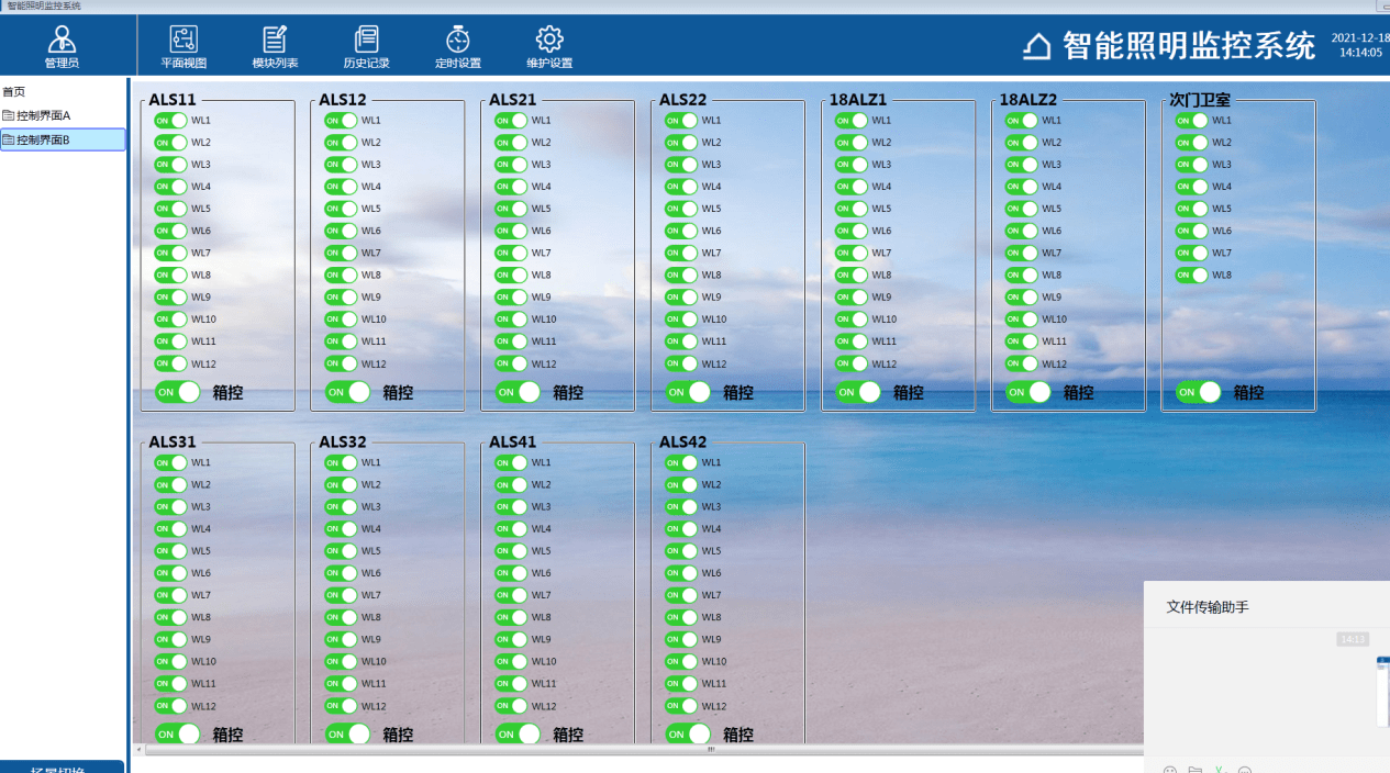 可以通过电脑或者触控终端控制一栋楼、某一层或某个区域所有照明灯具开关。可以对单个照明回路实现开关控制,还可对每个模块、箱子、楼层、自定义分区实现总控。现场受控回路的开关状态会实时反馈。