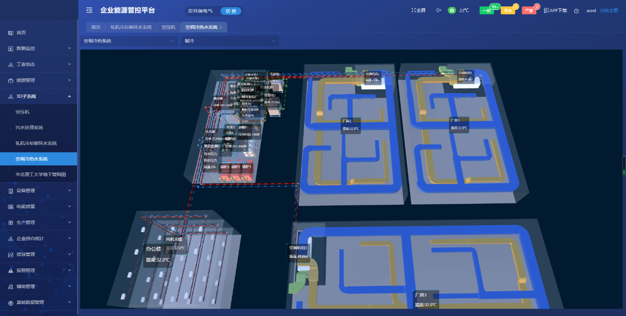 采集厂内制冷系统、循环冷却水系统、空压机系统、污水处理系统等运行数据,可对运行能效数据、历史数据、实时数据、累计电量、功率、分时段(年、月、周、日)电量及功率进行展示对比分析。