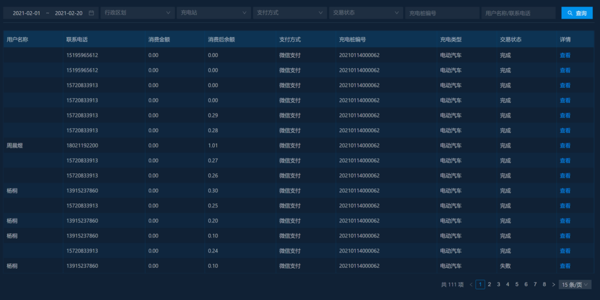 运营趋势可以按日/月/季度/年查询期间内充电金额、充电度数、充电次数的浮动曲线和数据。
