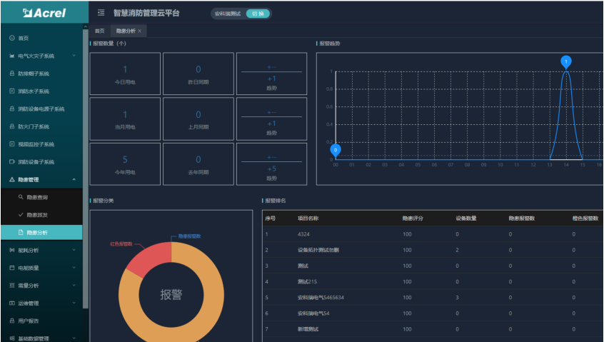 用户登录成功之后进入首页,如图所示。主要展示的内容有:项目概况、设备状态、探测器分类、设备报警信息、报警分类、报警统计、设备台账信息等。其中百度地图可以选配成3D建筑模型。
