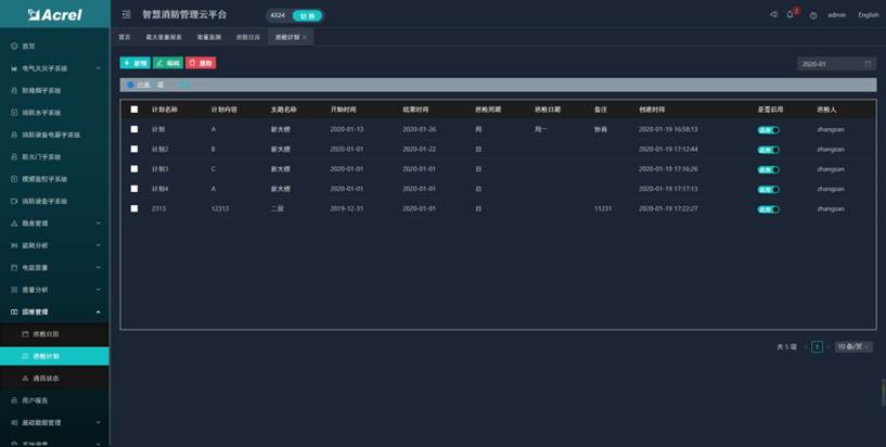 点击菜单中的巡检计划,进入对应的页面,对相关的巡检计划进行查看工单,切换日期来查询所要预览的数据,支持对巡检计划的新增,修改和删除。