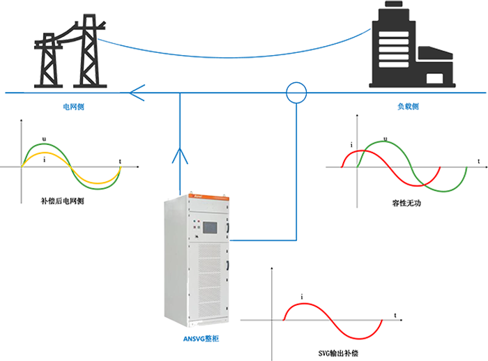 ANSVG静止无功发生器是一种用于补偿无功、谐波治理以及不平衡调节的新型电力电子装置。其基本原理为:检测补偿对象的电压、电流信号,计算提取无功分量或谐波分量,并生成相应的指令信号,通过驱动变流器模块的输出,产生一个与系统无功、谐波电流幅值相等、相位相反的补偿电流,从而抵消线路中的无功分量或谐波分量,达到无功补偿或谐波治理的目的。其应用可克服LC补偿器等传统的无功补偿器响应速度慢、补偿效果不能精确控制等缺点。